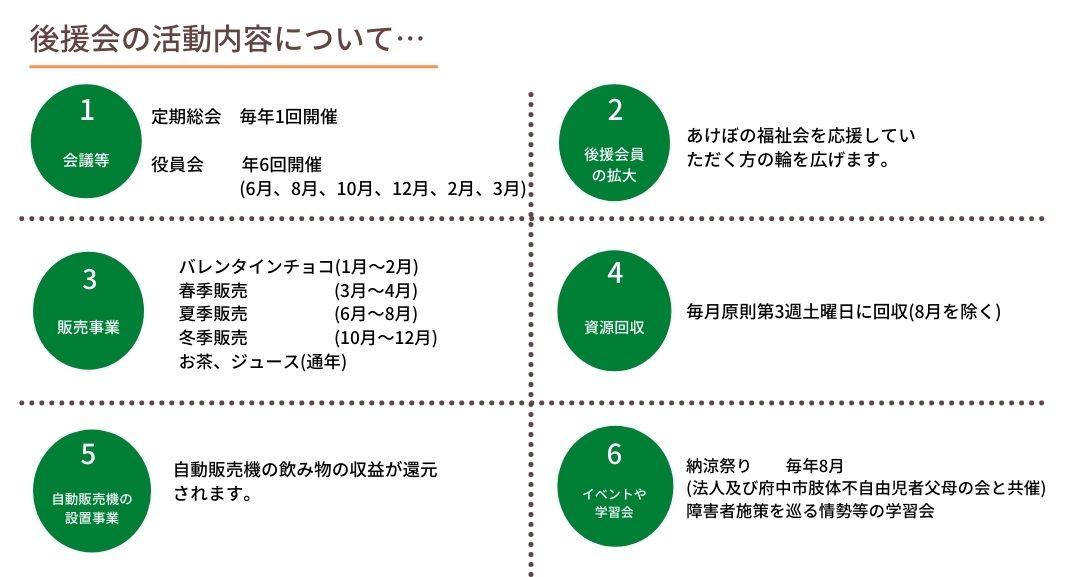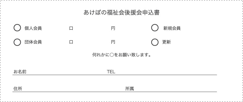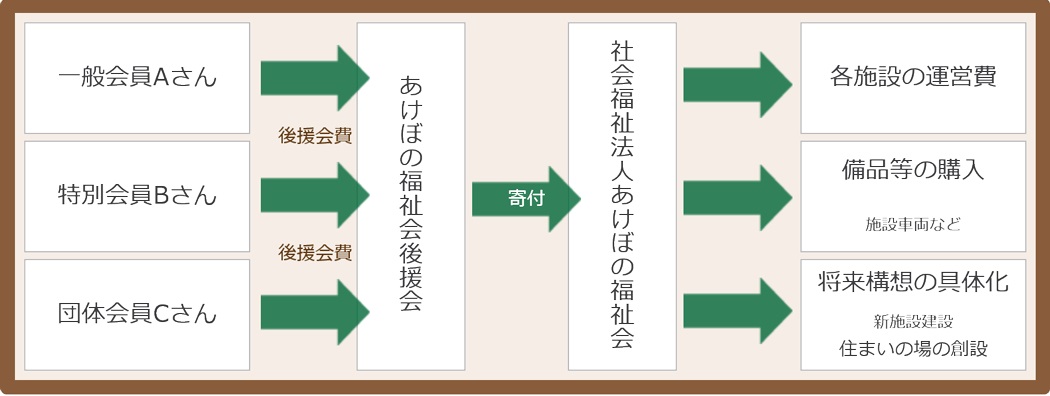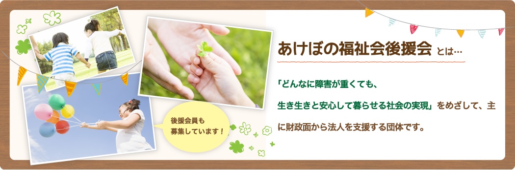 「社会福祉法人あけぼの福祉会」を「後援会費」という形で財政的に支えてくださる方です。 「後援会員」の方には、あけぼの福祉会で毎月発行している「あけぼのつうしん」をお送りするほか、各施設の行事のお誘いや、ボランティア案内、学習会のお誘い等、福祉会の情報をお知らせ致します。